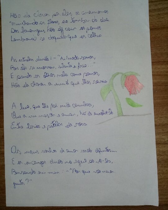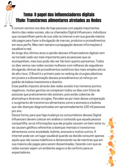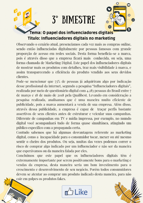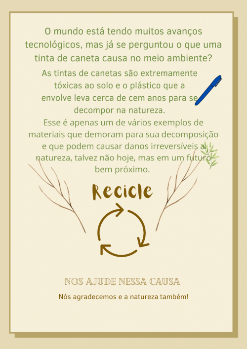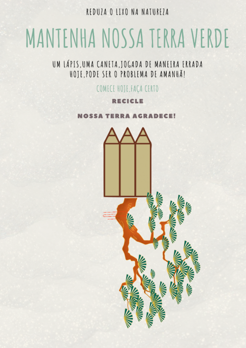 "Estamos vivendo em uma época em que as gerações têm um desejo enorme de ter tudo aquilo o que a televisão, propagandas, banners anunciam (...) principalmente os jovens e adolescentes que gostam de andar bonitos e impressionar. E esse é o grande problema, pois para serem produzidas (...) é preciso matéria-prima que é retirada da natureza, porém em uma quantidade tão grande que ela não consegue repor e após todo o processo de fabricação e consumo é obtida uma grande quantidade de lixo que acaba parando em terrenos, rios, ruas e todos já sabemos disso, mas o que fazemos para melhorar? Se queremos melhorar as coisas não podemos pensar somente em nós e que não fará diferença nenhuma se jogarmos nosso lixo aqui ou ali, Temos que pensar globalmente. (...)"
