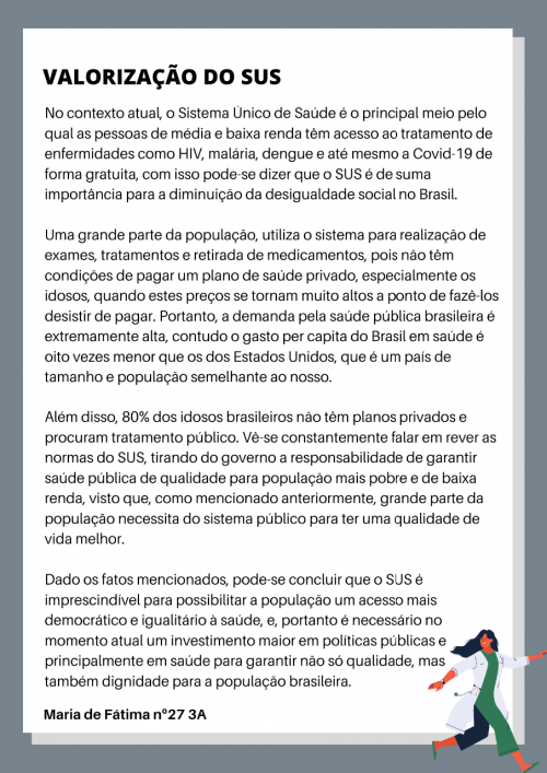 " A sustentabilidade é um meio de retirarmos da natureza o que precisamos para a nossa sobrevivência e desenvolvimento sem prejudicá-la. Infelizmente, há pessoas que tem a consciência da importância, mas não tem uma atitude boa, ou seja, ao invés de mantê-la limpa, dificultam o seu trabalho. (...)