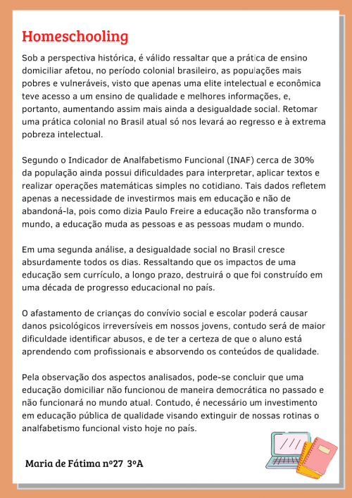 E para que isso não aconteça a família tem que ter uma estrutura e compreensão para ajudar, tentar dar à criança uma educação melhor, não sendo inconsequente com seu futuro."